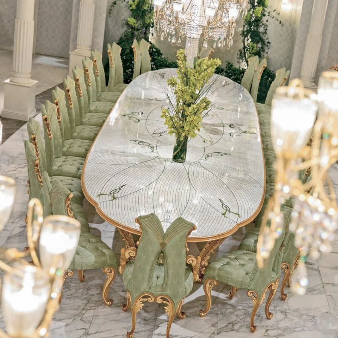 Золотой обеденный стол с мраморной столешницей для ресторана, 6 мест
