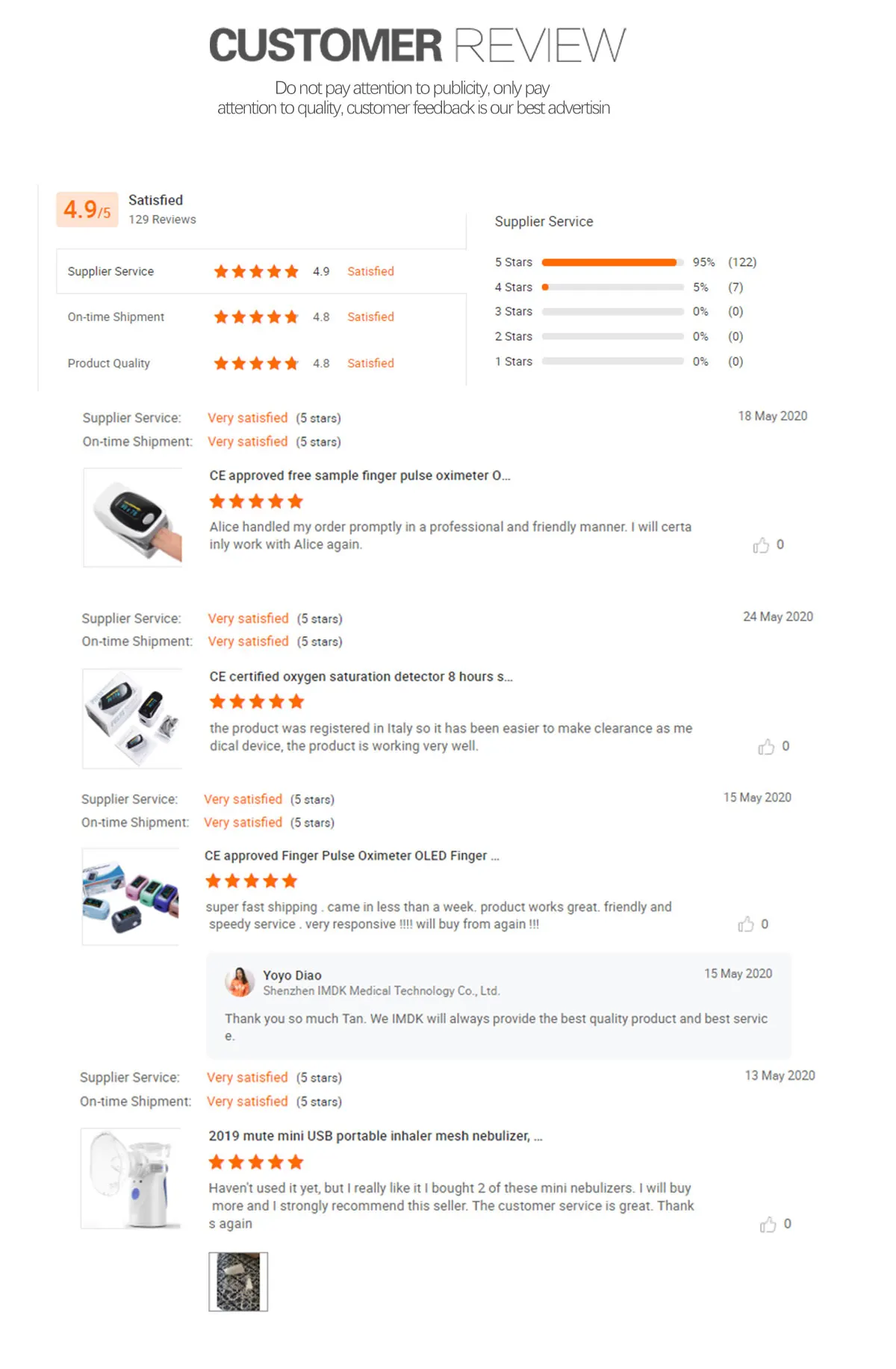IMDK is committed to developing innovative beauty and medical health products for global medical institutions and family support .In line with its core mission of "Care health,Joy life" we have always sought to innovate and grow.Our main products is Pulse Oximeter and non-contact infrared thermometer, The company has created a wealth of experience in sales and after-sales service team. Manufacturers and users in the formation of a very high reputation.