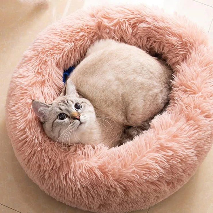 Фабричная теплая пушистая кровать для кошек с логотипом на заказ ручная работа розовый круглый пончик успокаивающие кровати мягкая зимняя длинная плюшевая домашних животных