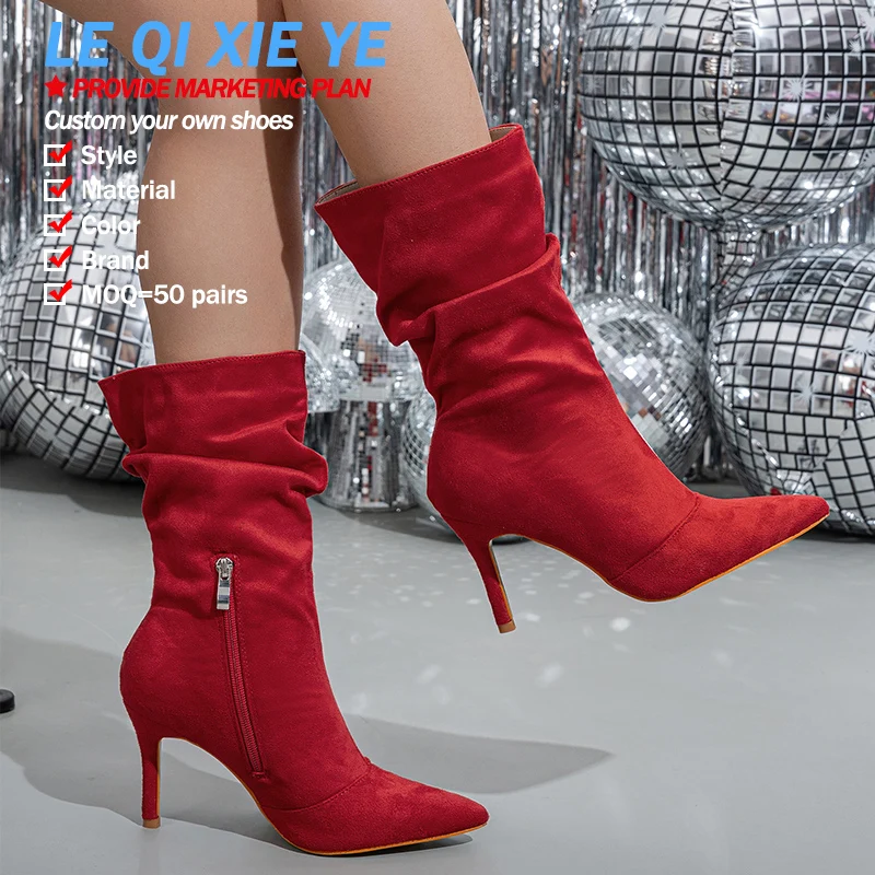 Модные женские ботинки с острым носком на тонком каблуке большие красные из натуральной замши морщинами простые осенние короткие сапоги 1 139,25 ₽ - 1 314,69 ₽