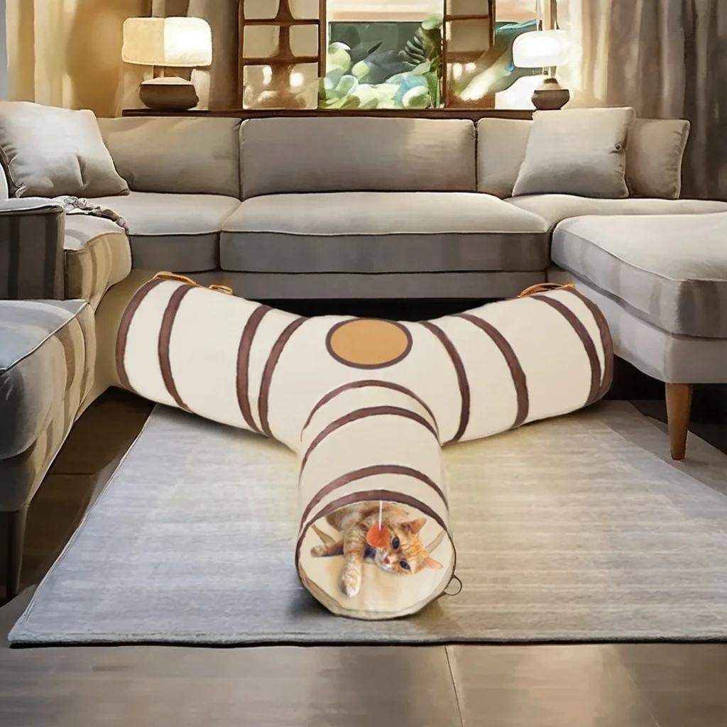 * 2 Tunnels&1 Cat Bed: Different from normal S-shape or T-shape tunnel, this cat bed tunnel consists of two semicircular tunnels and a round soft mat. Turned into a circular or s-shaped, it can meet kitten’s various play desire, and the soft plush mat in the middle is designed for cats to rest and sleep. Of course, all these 3 pieces can be separated if you want. * Extra Bonus of Fun: It features an integrated peep hole that allows pets to see out and view the outdoors,making it an awesome location to hide and stalk from. Besides, the play tunnel equipped hanging ball at the entrance add more way to have fun that brings hours and hours exercise and self amusement as bating and swatting. * Soft Plush for Touching!: Soft and durable, this tunnel bed is made of long plush fabric to keep your furry friends warm and snug. Especially the upgraded thickened cushion filled with cotton in the middle of the tunnel is more filling, more comfortable for resting without disturbance. Besides,the flexible steel wire construction ensures that it won't easily deform. * Safe and Easy Storage: This donut cat tunnel consists of two semicircular tunnels and a pet mattress. Strings are tied at each side of the tunnel for easy removal and installation. It pops up seconds and folds down into small item that is super easy to carry and storage. * Suitable Size for Multiple Cats: The cat tunnel is 36”WX36”DX9.5” when in circular. And it is perfect for 10kg(22 lbs) below cats, small size dog and other animals like rabbits and ferrets. We have an efficient after-sales team. If you have any question, please feel free to contact us. |