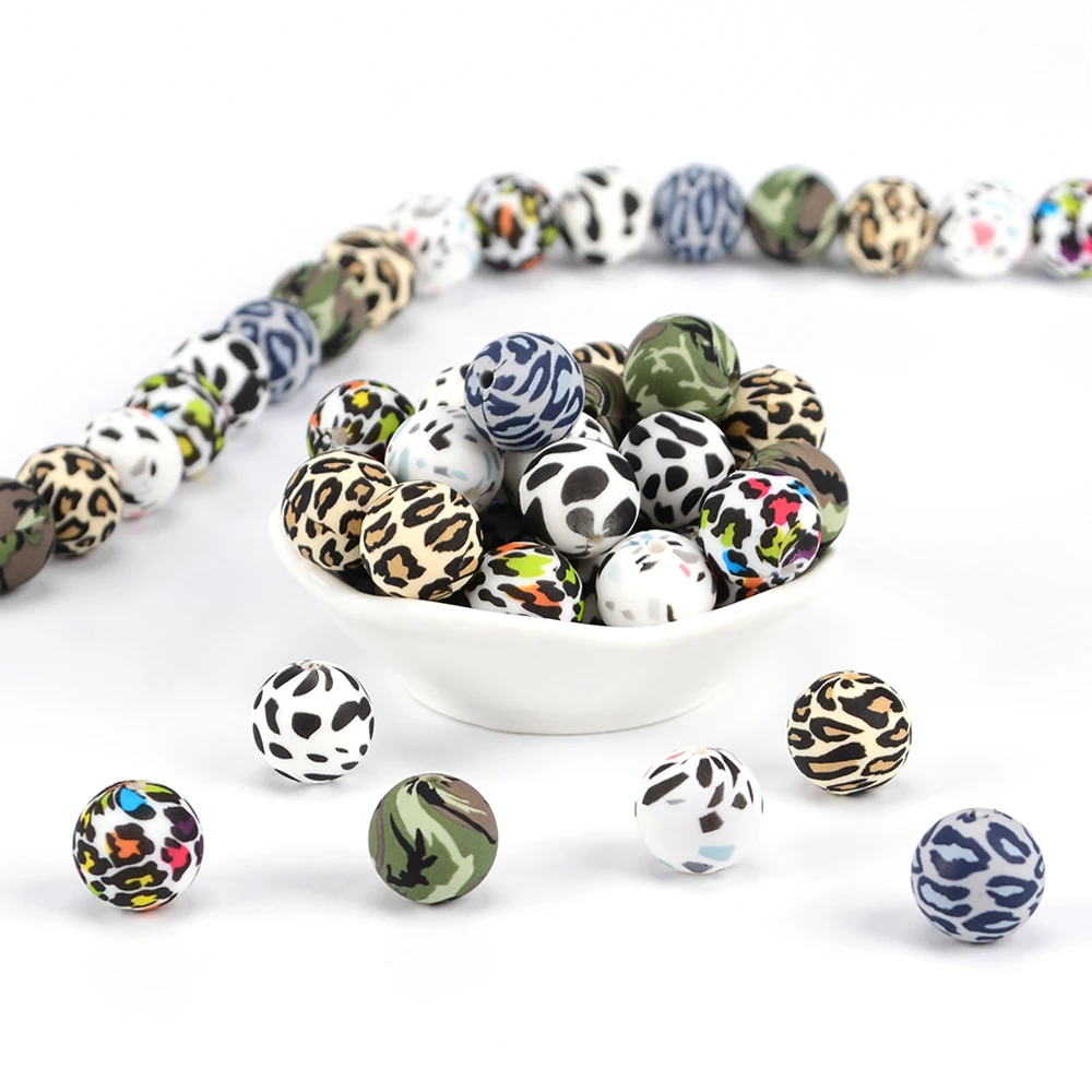 Новый дизайн 2022, популярные силиконовые бусины с леопардовым принтом, пищевой класс, 15 мм, круглые силиконовые бусины для прорезывания зубов, для браслета-брелка