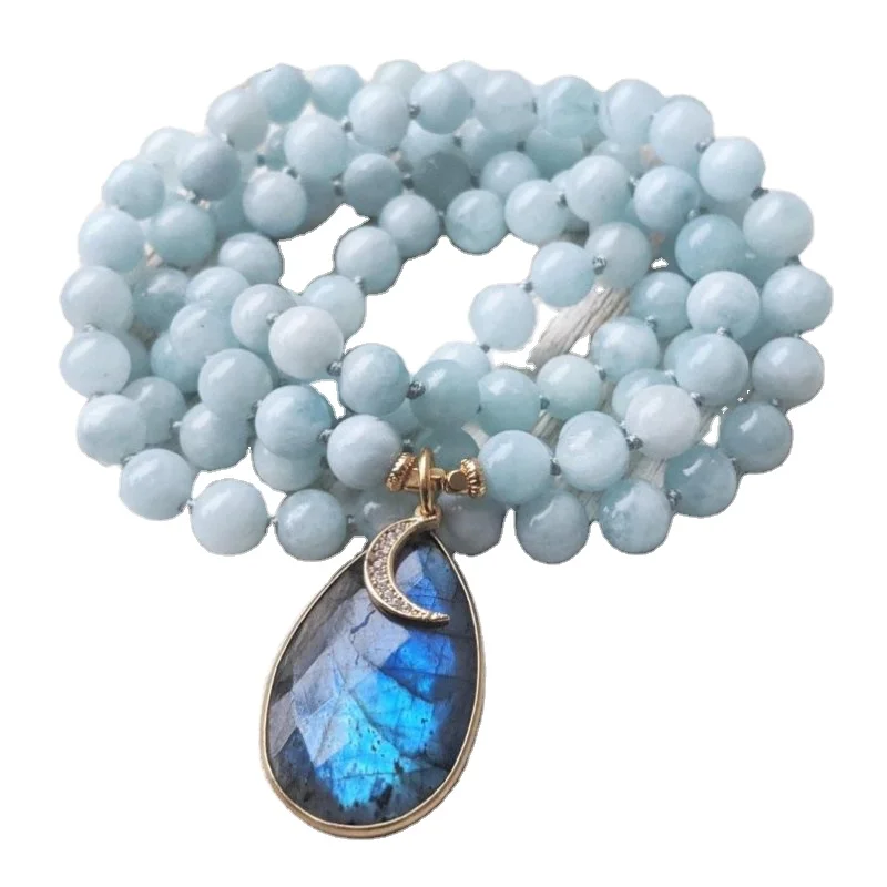 MN31559 ожерелье из бисера мудрость Исцеление египетской богини Исида Аквамарин мала 108 Мала с подвеской в виде полумесяца