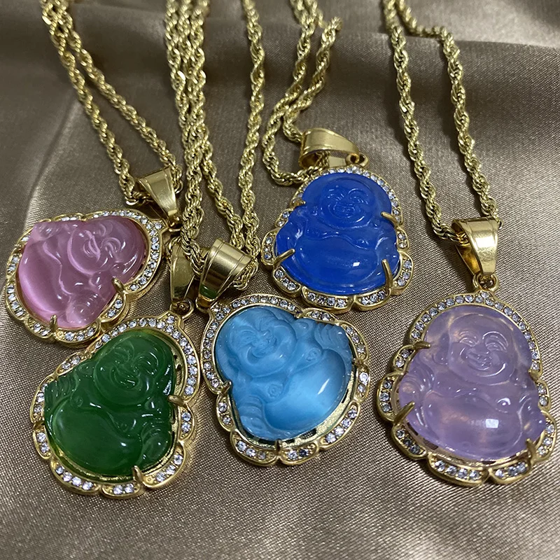Новейшее новое ожерелье из нержавеющей стали с подвеской зеленого нефрита Красного фиолетового Агата смеющегося Будды