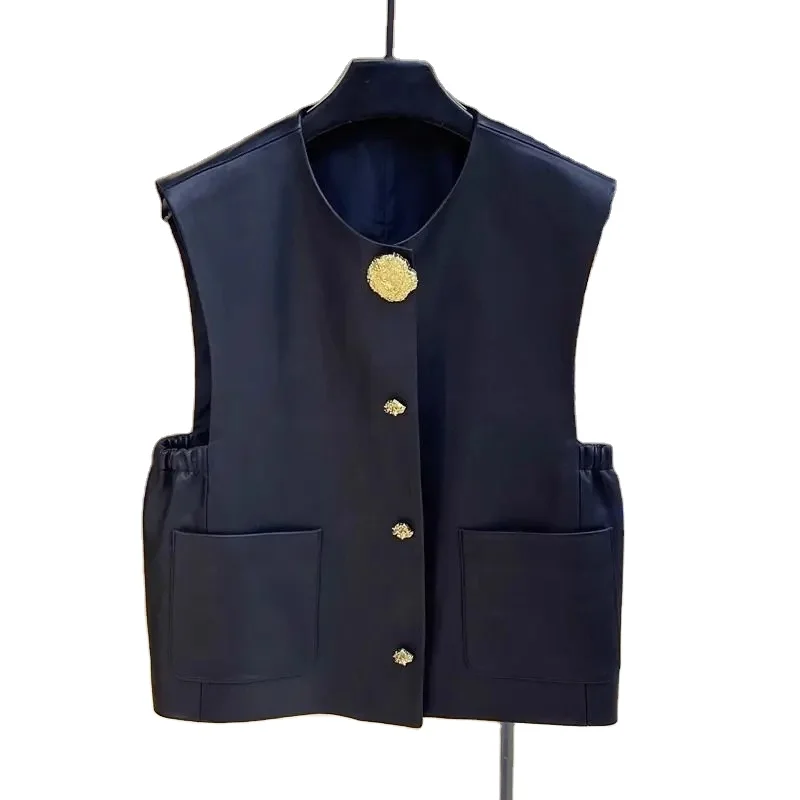 Новинка Осень натуральная кожа жилет женская повседневная короткая майка без рукавов с круглым вырезом Металлическая пуговица хлопок 40,00-65,00 $