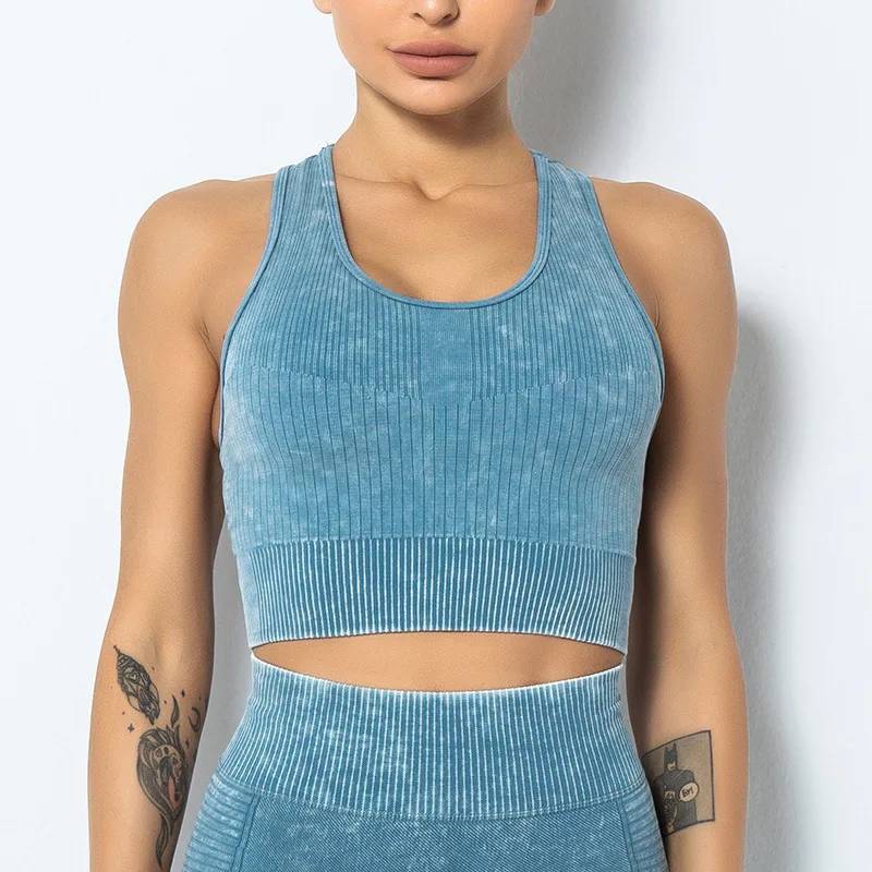 Пользовательский кислотно моющийся фитнес йога спортзал ребристые бюстгальтеры камни Мытые винтажные Бесшовные Спортивные Бюстгальтеры комплект