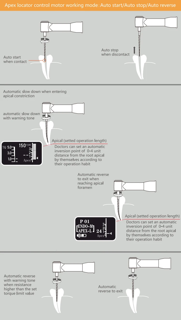 Apex locator control motor working mode | auto start/auto stop/auto reverse |