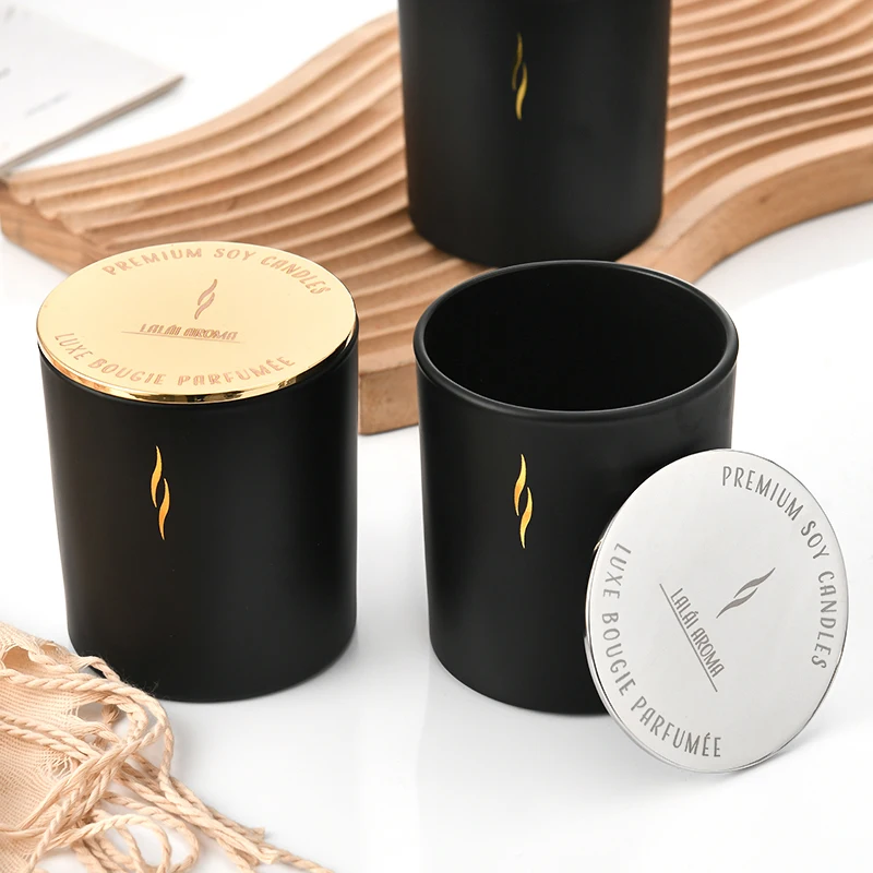 Роскошные круглые матовые черные подсвечники для масла Оловянная ароматерапия восковая стеклянная банка для свечей под заказ логотип деревянная крышка металлическая крышка