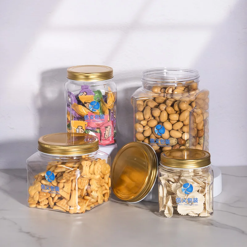 Производитель оптовая продажа пустые пластиковые квадратные банки для упаковки зерновых орехов хранения пищевых продуктов с алюминиевой крышкой