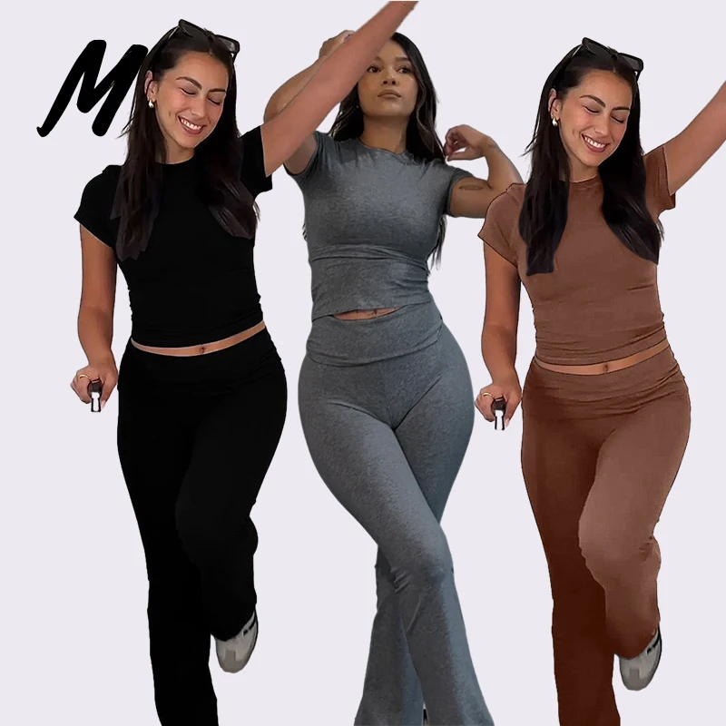 2024 Женский комплект из двух предметов топы с коротким рукавом и длинные брюки Повседневный тренировочный костюм Однотонный женский спортивный для бега