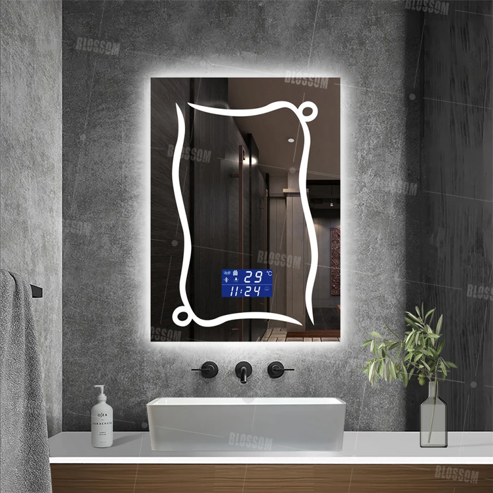 2023 новый дизайн отель ванная комната противотуманный Сенсорный Экран smart LED настенное зеркало с отображением времени и bluetooth