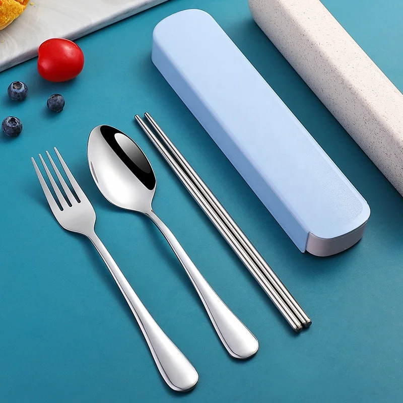 Многоразовая металлическая ложка вилка и палочки для еды из нержавеющей стали серебряные столовые приборы 3 шт./компл. дорожный набор столовых приборов в чехле/футляре