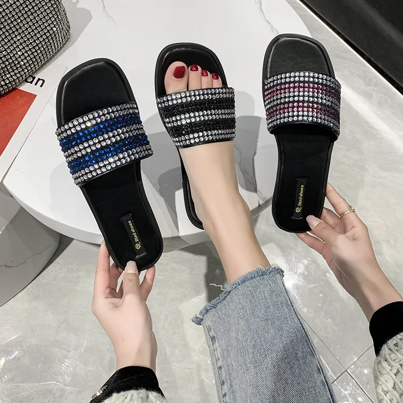 Женские сандалии со стразами плоская подошва открытый носок пляжная обувь разноцветные лето