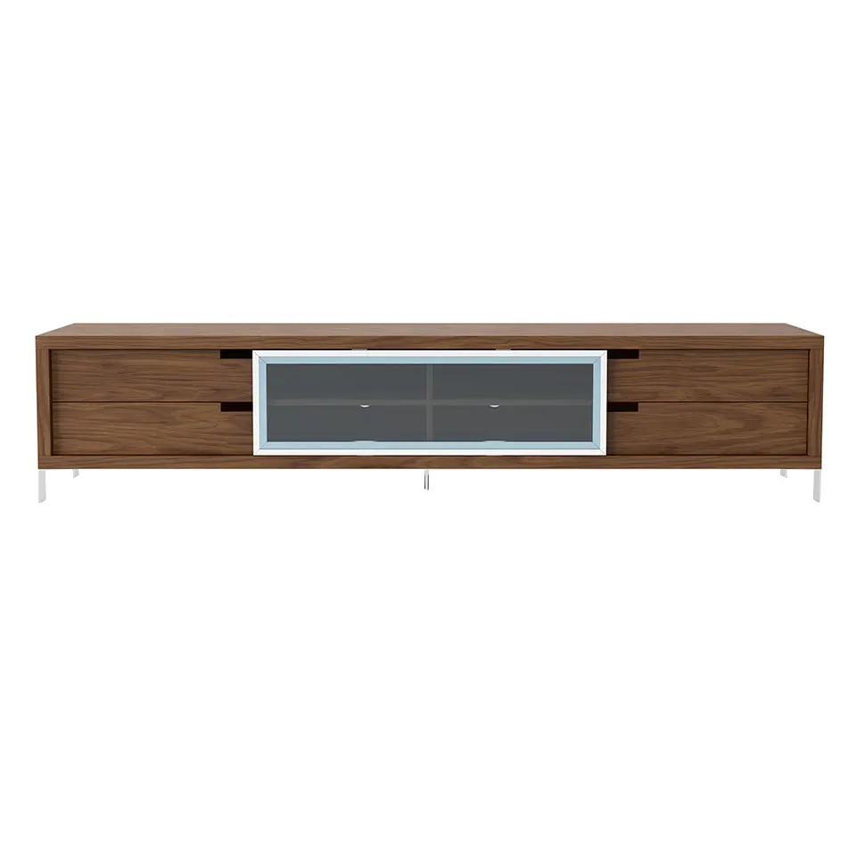 Шкаф для телевизора из орехового дерева с четырьмя ящиками и раздвижной дверью закаленного стекла на продольных направляющих.