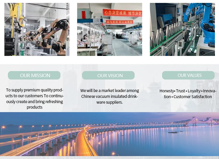 1. Are you a factory or just a trading company?Yes. We’re a vacuum insulated drinkware manufacturer since 2008. We focus on developing and manufacturing high quality vacuum insulated bottles, flasks, tumblers , Dog bowl ,Wine tumbler ,can coolers and mugs that aim at keeping drinks hot or cold for long hours.