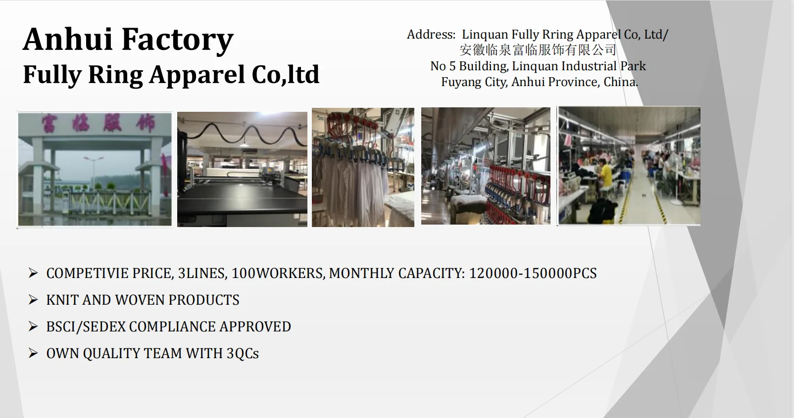 Our annual turnover is more than USD 10 million. Our capacity is 2 million pieces of T-shirts, 1million pieces of sweaters, 2 million pieces of seamless underwear, and 1 million pieces of woven garments.