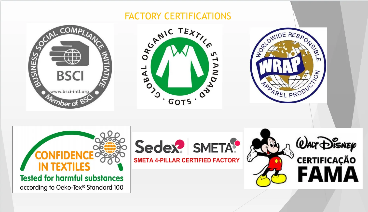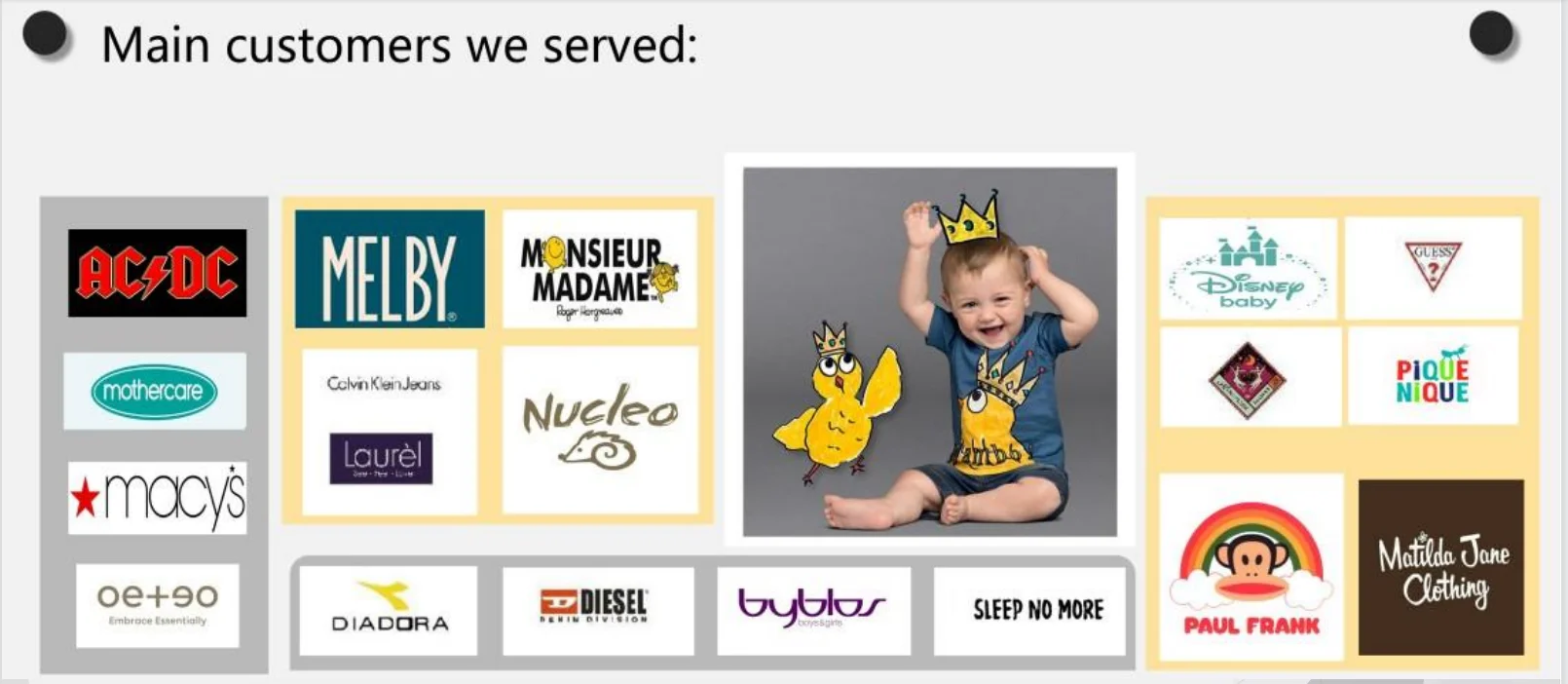 Our customers are GUESS, CK, ARTIGLI, BYBLOS, MELBY and NUCLEO in Italy, LIVERPOOF in Mexico, ONESTEPAHEAD, MOTT 50, BRYAN, TERENCE, MOUNTAIN MAMAS and RFJO in USA, OTTO UK in UK, LITTLEPHANTE in Sweden, OKAIDI in France, Le Chic in Netherlands, OTTO in Japan, NKD, BONITA, LAUREL, LEBEK BARBARA, and FRANK WALDER in Germany, TGS in Australia, DOMINIC in Canada, etc.