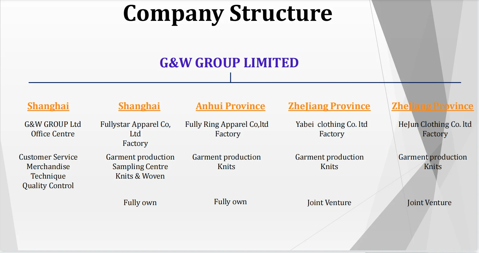 G&W (GROUP) LTD. is the specialized garment company, to focus on sourcing and production. We have three own factories, which are located in Shanghai / Zhejiang / Anhui. The Shanghai and Zhejiang factories mainly produce the circular knitted garments, like jersey T-shirt, fleece jacket, dress^ and our Anhui factory focus on the woven garments, like the pant, jacket and shirt.