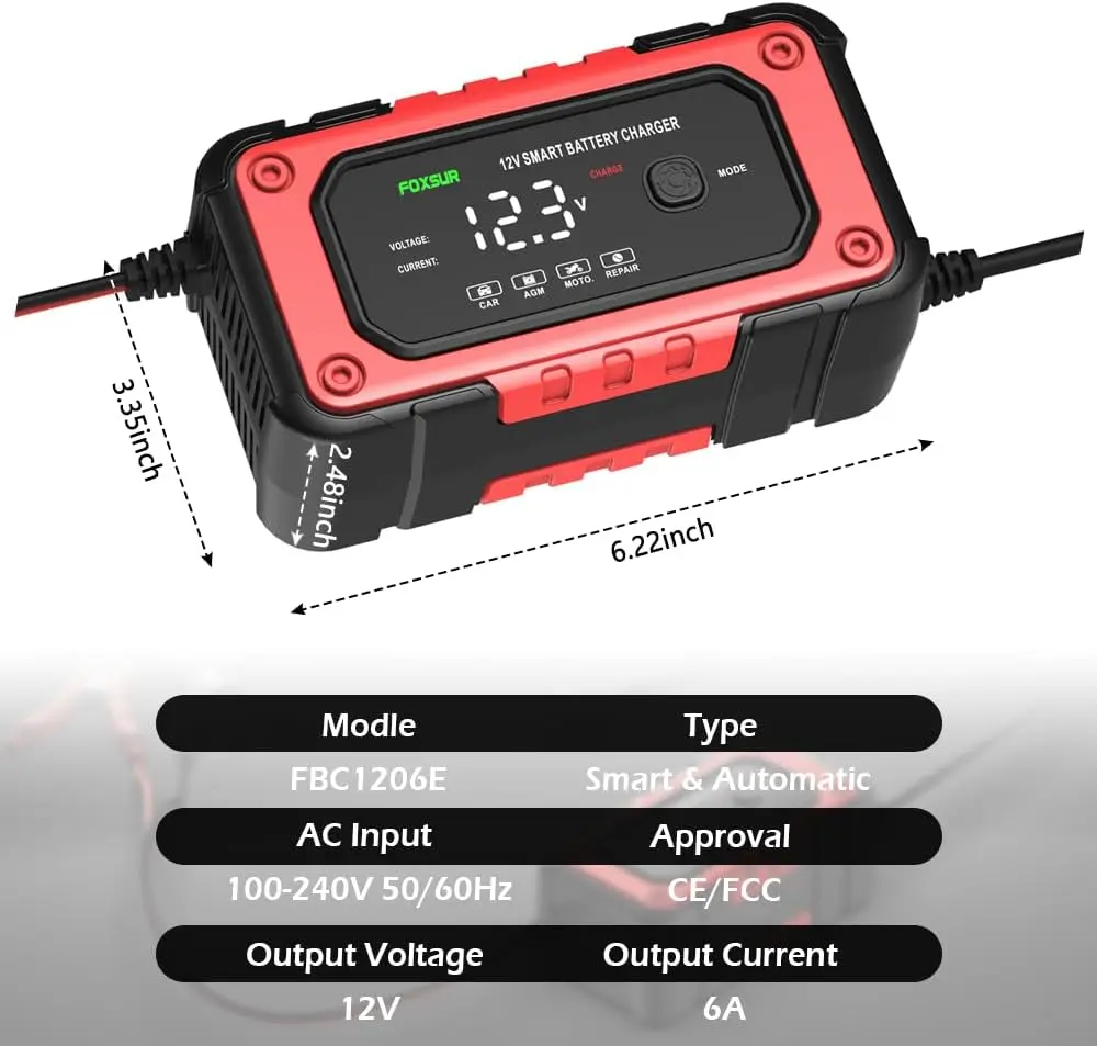 * [Battery Maintain Function:]Foxsur car battery charger, also battery maintenance device, Pulse repair function can help to repair your loss battery and extend battery life.(Note: It can not activate a dead battery or repair a battery which is damaged seriously; it also can not repair a battery back to 100% new.) car battery charger is covered with a protective film, After removing the protective film, you will see a brand new screen.