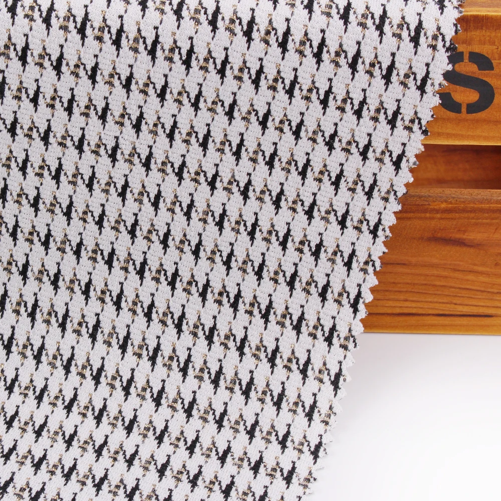 Latest Fashion Fancy Stretch Knitted Houndstooth Jacquard Fabric Poly Rayon with Metallic Gold Yarn for Luxury Band Lady Dress 313,62 ₽ - 387,35 ₽