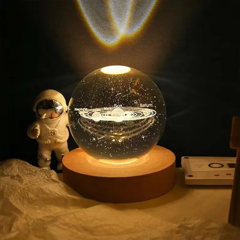 Solar System Planet Sphere Laser 3D Interior Carved Small Night Light Crystal Ball with Wood Base LED Light Night Lamp