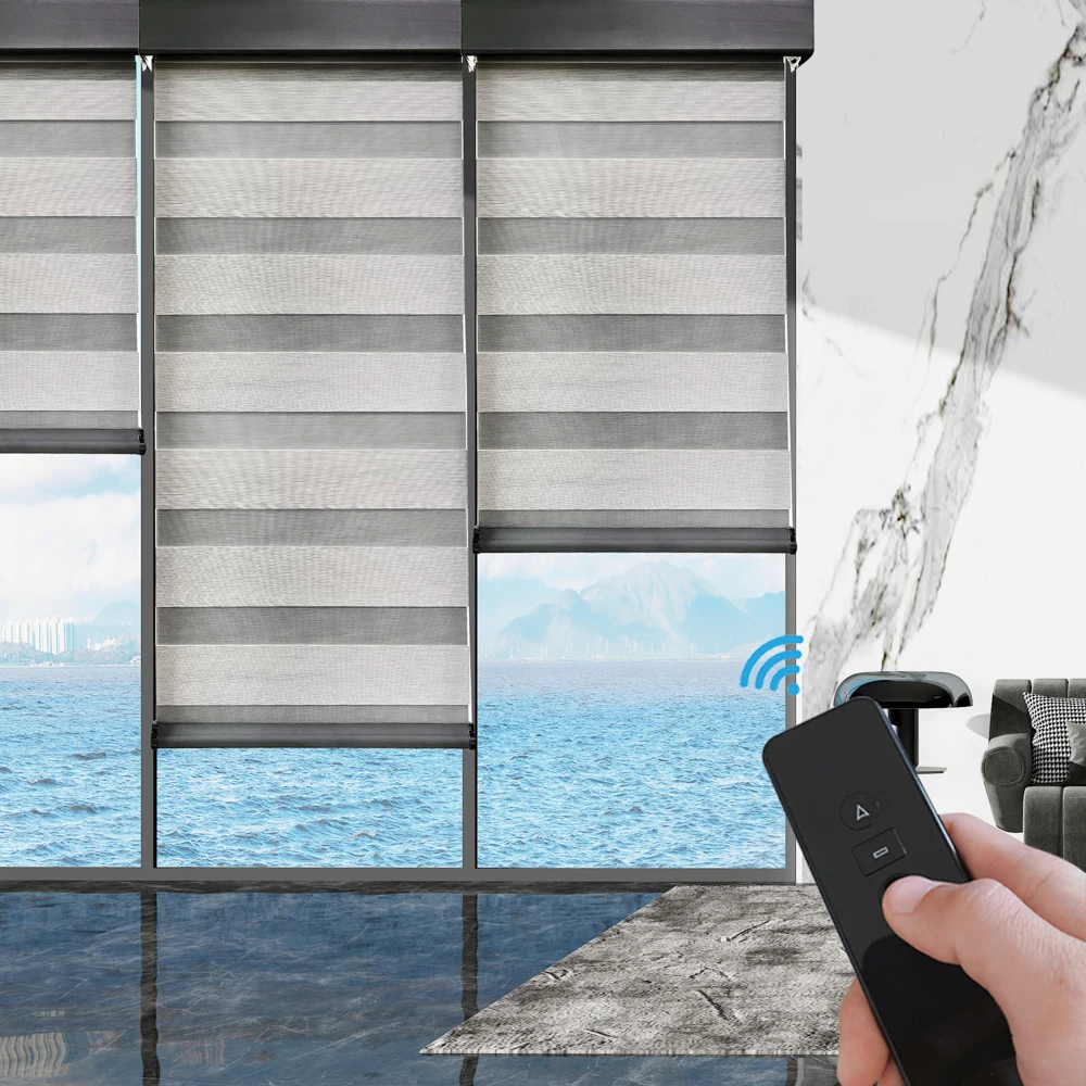 Изготовленные на заказ моторизованные шторы с Wi-Fi для офисного дома Роскошные коммерческие световые затемняющие Двойные Прозрачные тканевые мини-зебры