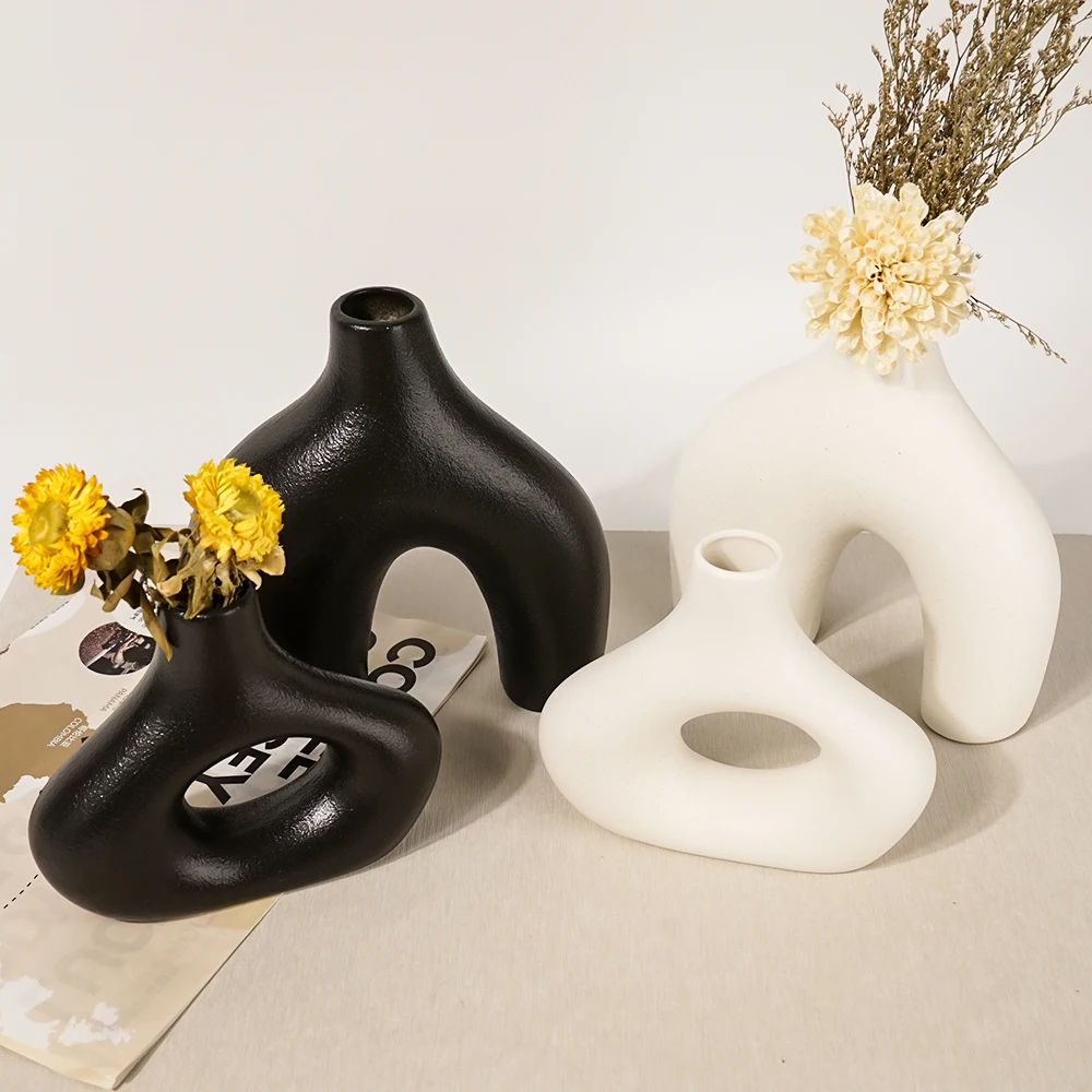 Оптовая продажа декоративные фермерские дома круглые полые белые черные современные керамические вазы