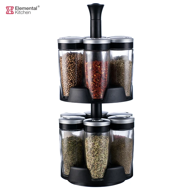 Best Selling 12 Jars Spice Rack Set with Silver&Black Color Lid and Glass in the Box Also OEM ODM