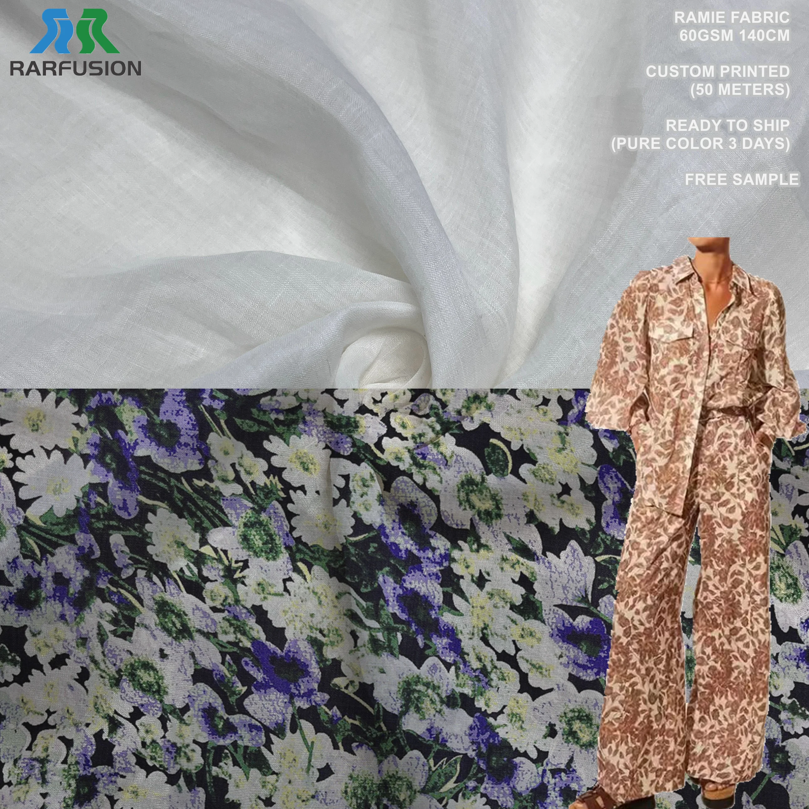 Оптовая продажа в наличии 100s ткань высокой плотности из чистого рами Экологически чистая Легкая однотонная льняная для легкой ткани рубашки платья брюки