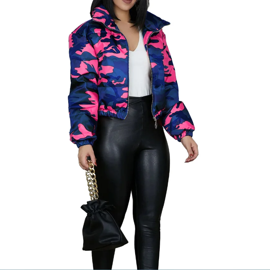 Зимняя женская короткая парка с высоким воротником и длинным рукавом пальто на молнии камуфляжным принтом верхняя одежда для улицы куртка ночного клуба короткое