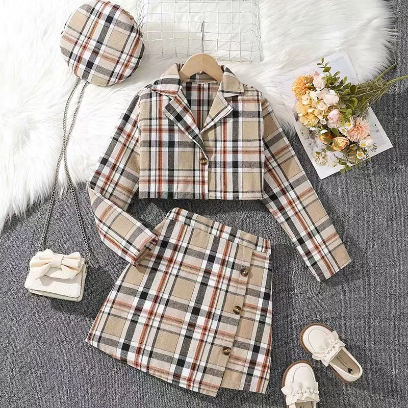 2025 Осенняя коллекция оптовая продажа повседневный комплект одежды из 2 предметов коричневая рубашка без рукавов с V-образным вырезом и юбкой хлопка для подростков