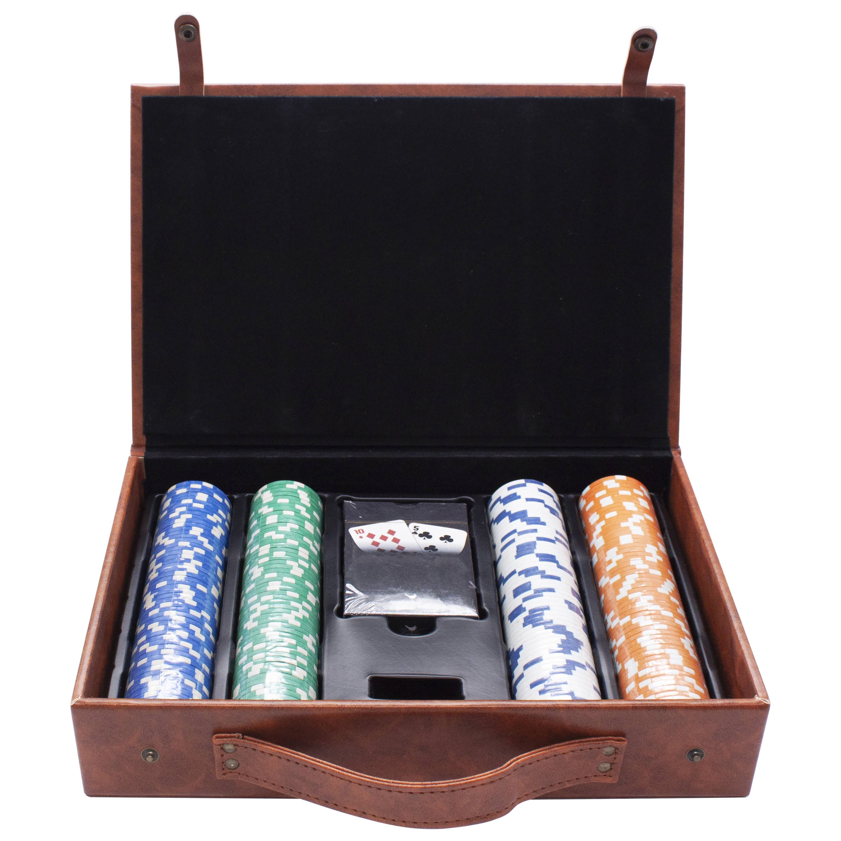 Capacity | 500pcs poker chips (size: 40mm), 2set playing card (szie: 67*87mm), Dealer button*1/All in*1/Big blind*1/Small blind*1 5pcs dice(size:16mm), 2pcs keys |
