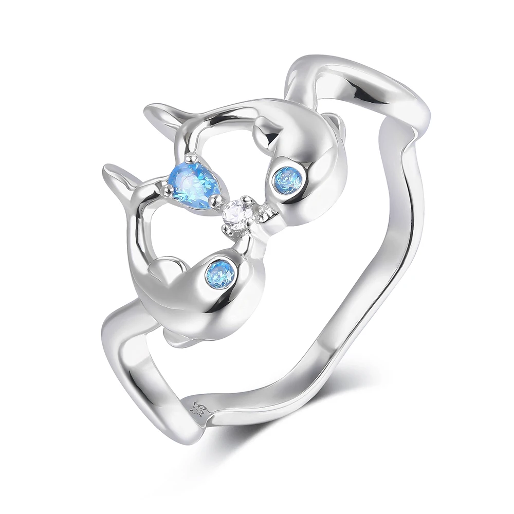 Модные ювелирные изделия Два дельфина поцелуи воды спрей Циркон волна кольцо 925 стерлингового серебра