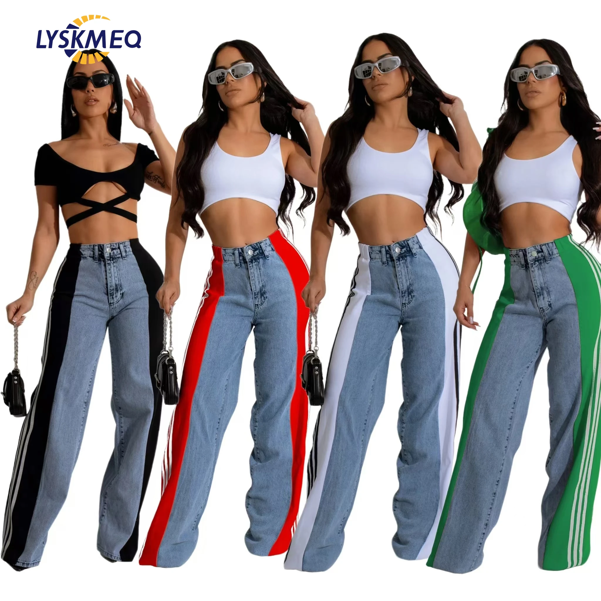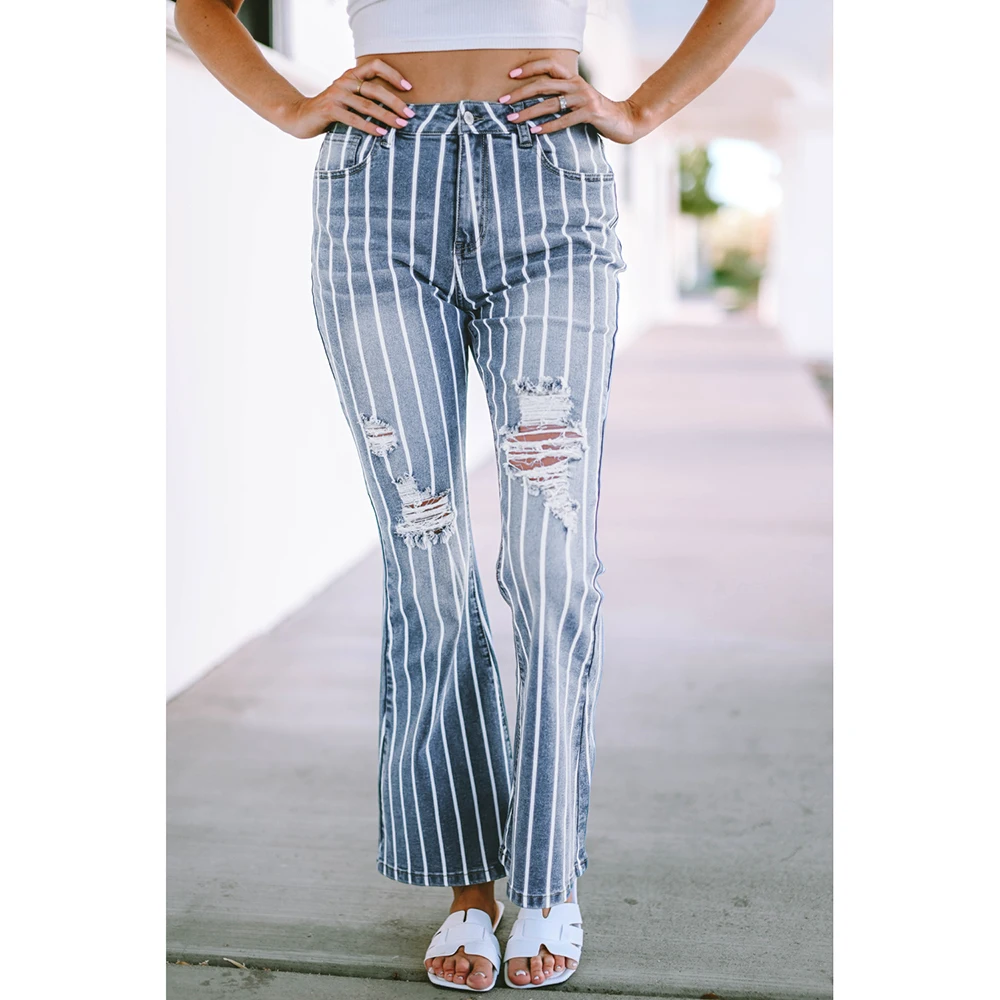 Голубые командные индивидуальные высококачественные повседневные вышитые узкие состаренные женские джинсы со средней талией расклешенные с широкими штанинами