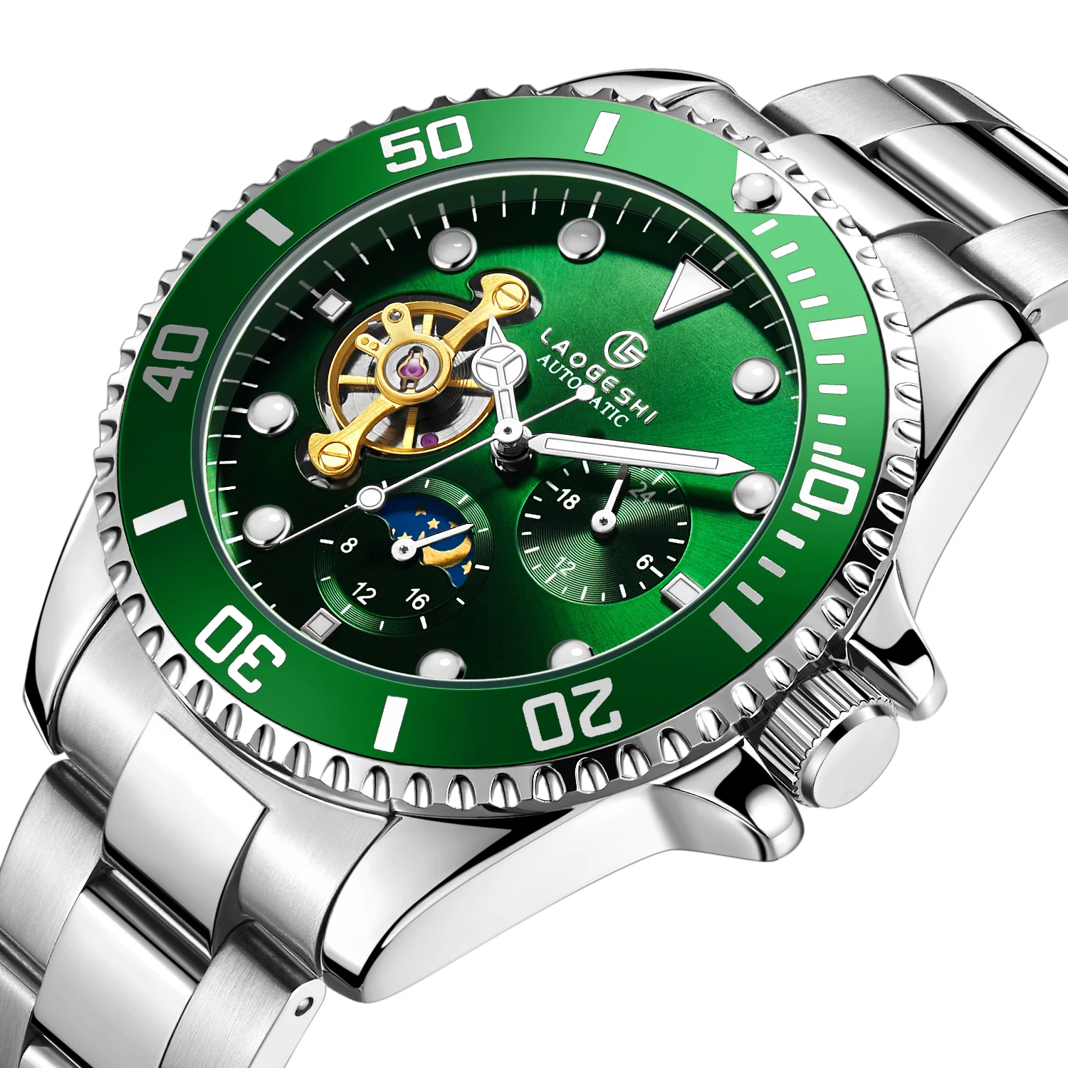 LAOGESHI Роскошные наручные часы из нержавеющей стали водонепроницаемые мужские светящиеся автоматические механические с турбийоном дайвером для мужчин