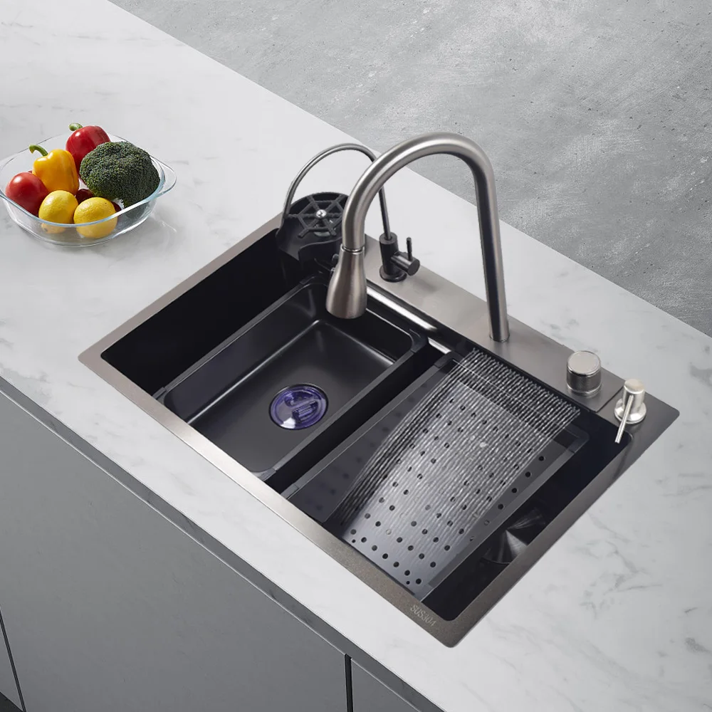 Цифровой дисплей черный кухонный сосуд Раковина Водопад кран 304 из нержавеющей стали чашка Омыватель Летающий дождевой кухонная раковина