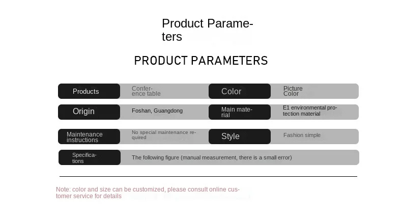 | Color | 2.0 meter conference table, 2.4 meter conference table, 2.8 meter conference table, 3.2 meter conference table, 3.5 meter conference table, 3.8 meter conference table, 4.0 meter conference table, 4.5 meter conference table, 5.0 meter conference table |