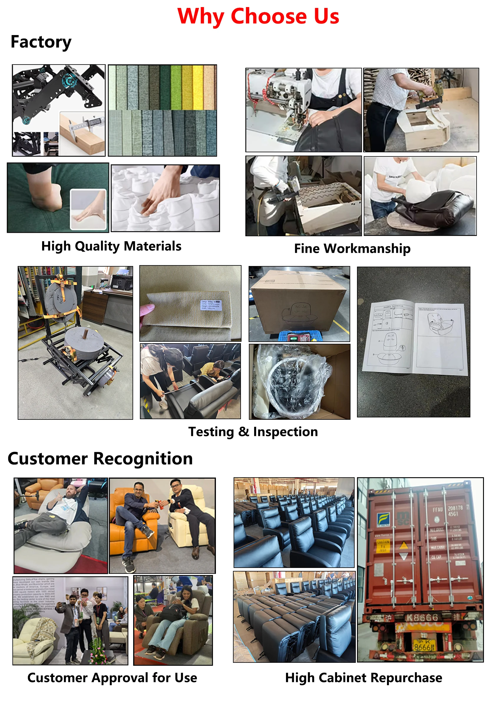 Customize Feature | We can make diffierent specification sofa for you. For example: massage, sound system, cooling cup holder, phone holder, wireless charging, etc | |||||