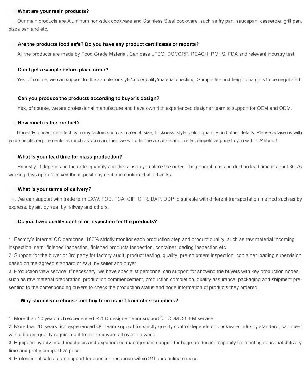 ① The cast LOGO on the cooker body, the first order is 500 pieces ② Customized mold fee USD800.00-USD3000.00 of each piece of pot or lid. ③ Mould making time about 7-25 days. ④ Sample production time is about 3-15 working days ⑤ Batch order lead time about 20-60 days. | |||||||