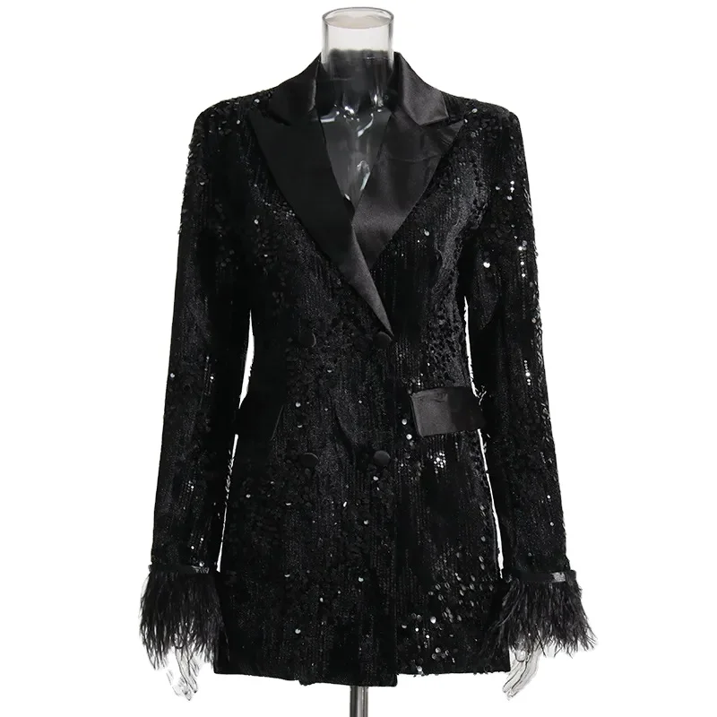 Роскошный комбинезон с блестящими блестками Тонкий Блейзер атласный шелковый пиджак отворотами и страусиными перьями отделкой на рукавах 15,00-17,00 $