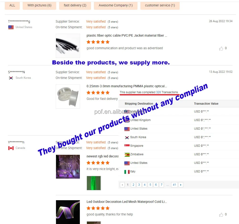 We are the factory to manufacture plastic optic fiber and the products which made of plastic optic fiber. So,our products include: PMMA Optic Fiber, MMA Optic Fiber, Fiber Optic Light Kit for Sauna Room, for house ceiling, for car roof, Fiber Optic Starlight Panel, Fiber Optic for swimming pool, Light Engine, End fitting, Luminous Fabric,Luminous Cloth, Optic Whip, Optic Mask, Plastic Fiber Optic Patch Cord, M.O.S.T. Cable, Toslink Cable, TOCP155 Cable and so on.