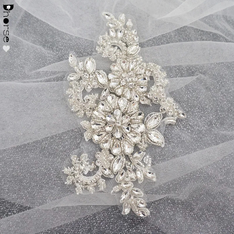 Производитель Гуанчжоу пришил белые серебряные кружевные блестящие аппликации со стразами для свадебного
