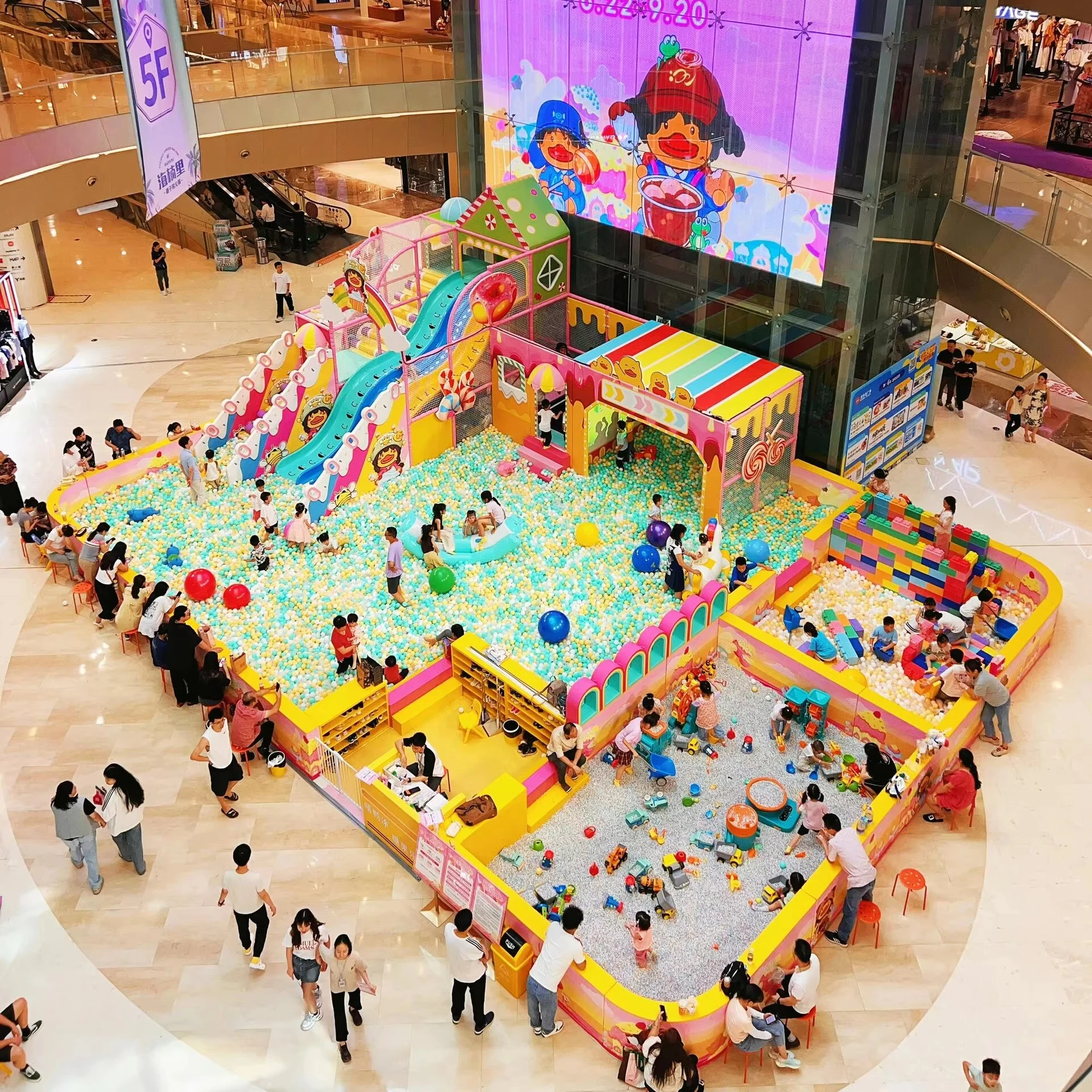 Components | Fun ball battle, 3-lane slide, Hans slide, Sphere with dome, Double slide small, Round ball pit, Soft water slide, Big ball, Forest, Web crawl, Cannon, Punching bags, Roller run, Adventure bridge, Square ball pool, Punching Bag-spike, Brick, Moon walk, Pyramid, Carousel, Toy bricks, Number bricks, Interactive panels, Decorations. |