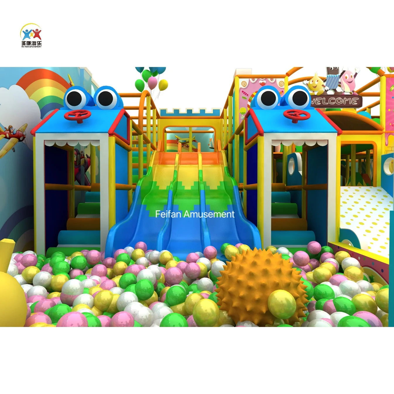The product itself with strong cartoon style design attracts a lot of children. The internal structure of the product is complexity, but also improved the playability at the same time which contained varieties of elements, you may see the 3-lane slide, tubes and other candy themed panels all around, also we’d added famous products FUN BALL BATTLE inside which won a lot of praise from all of our customers. Moreover, there is a toddler area nearby which allow 3-12 years old children to have fun together and definitely children can enjoy themselves as much as they like inside the candy kingdom.