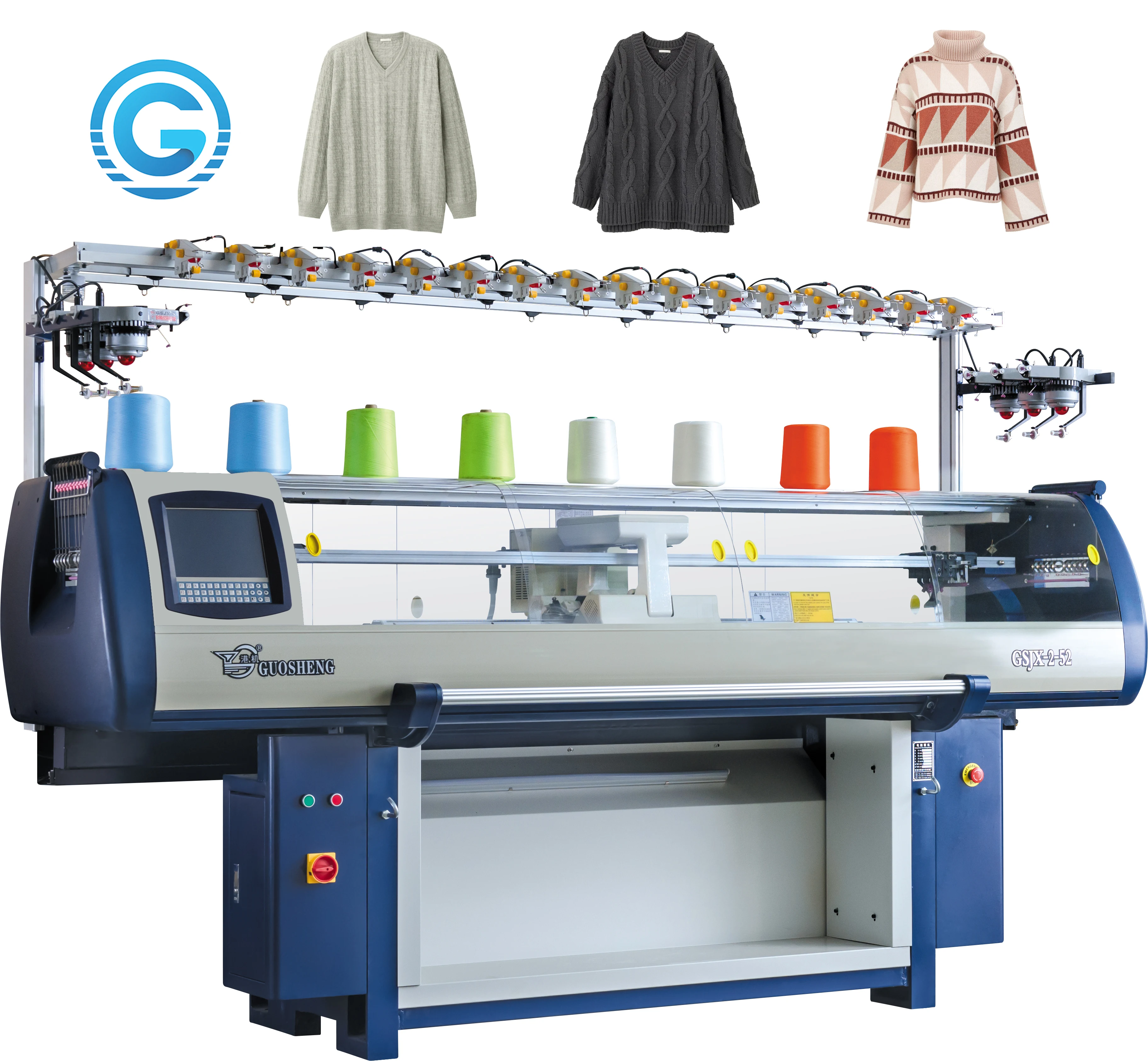 Смонтированный с помощью вспомогательных машин, он может вязать трикотажное плетение в манжетах и воротнике, а также одинарная/двойная колыбель и волнистые переплетения.