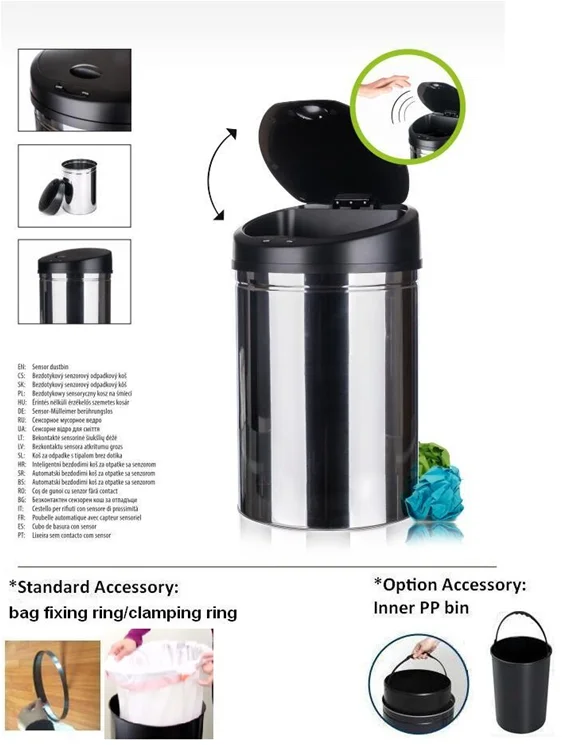 * Infrared induction dustbin with the cover automatically opening and closing.