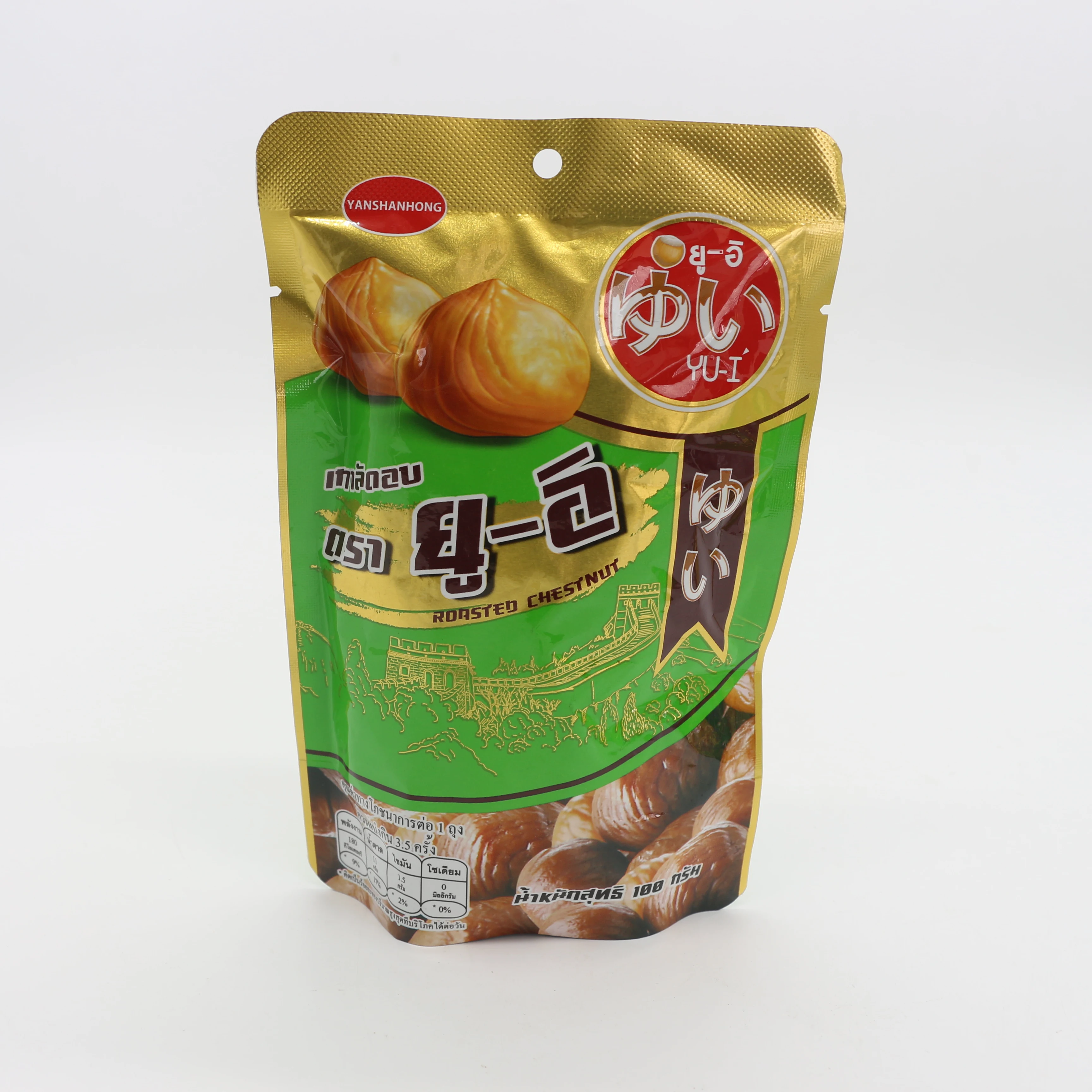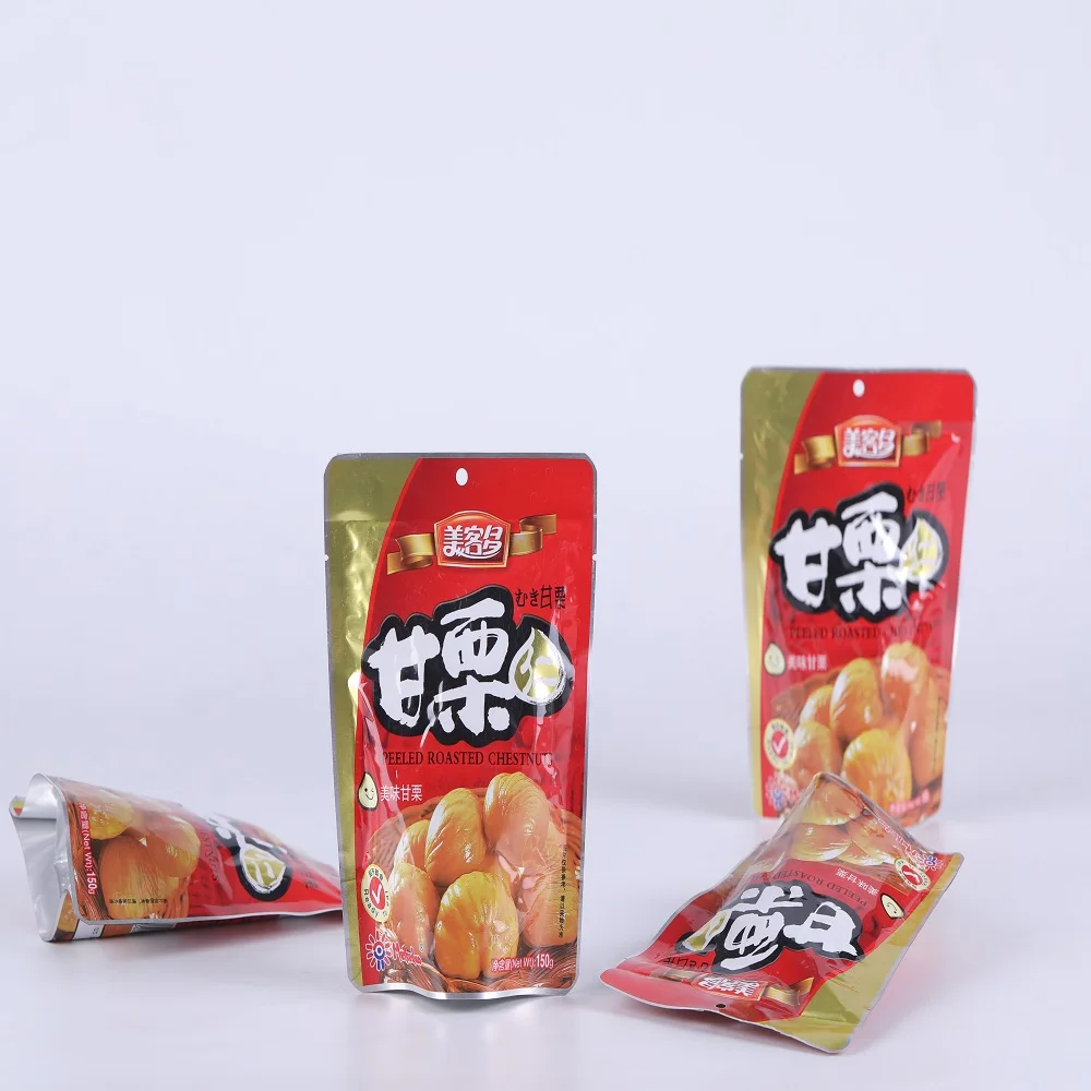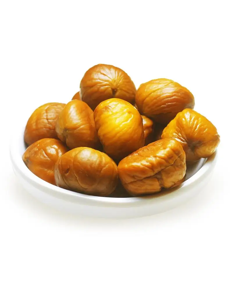 Chinese Peeled chestnut produced by our company is made of fresh chestnuts from our planting base. Special advantages of geography and climate in Qianxi make chestnuts have unique features. Roasted Peeled chestnuts, using frozen shelled chestnuts, are produced by pouring in, weight, vacuumizing, filling Nitrogen, sealing, killing bacteria with high temperature and high press. The whole process is executed under total enclosed asepsis environment.