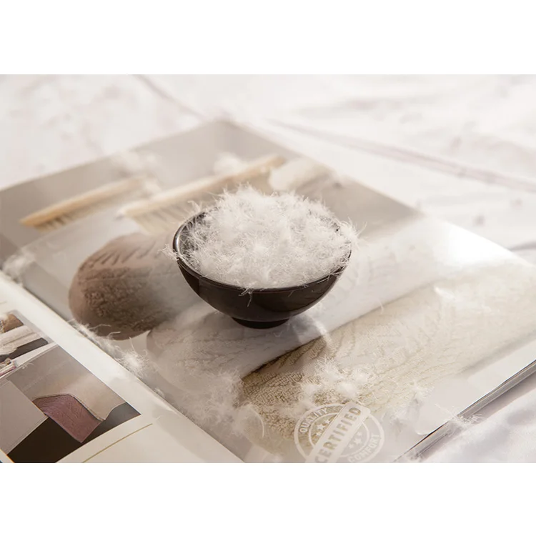 | Технические характеристики | 1. Хорошая мощность наполнения 2. Меньше Sharmp 3. Мыть в чистоте 4. Прозрачность 500-600 5. Стандарт EN, стандарт США, стандарт IDFL и т. Д. На выбор 6. По низкой цене 7. Хороший наполнитель для матраса, подушки, подушки и т. Д. |