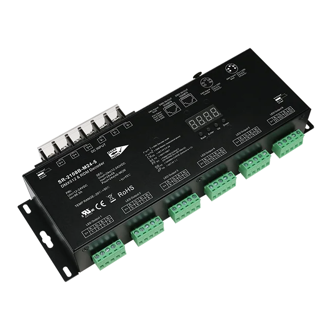 This device is a DMX controller, it can receive DMX signals. The Equipment is DC 9-12 V, minimum current 300mA, and only for indoor use.