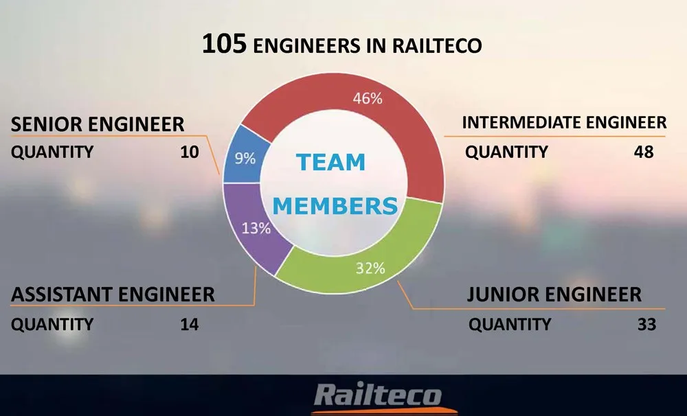 There're 350 associates in Railteco, of which, 105 Engineers in total. 10 senior engineers, 48 intermediate engineers, 33 junior engineers, and 14 assistant engineers of the 105 engineers.